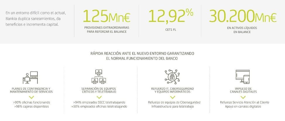 A nivel de particulares, la entidad financiera permitirá flexibilizar el pago de las cuotas de los préstamos a través de carencias de hasta un máximo de seis meses en los créditos de clientes afectados por la crisis. Asimismo, ha puesto a disposición de las empresas líneas de crédito inmediato de hasta 25.000 millones de euros y ha suscrito la Línea ICO de 400 millones para apoyar al sector turístico, del transporte y la hostelería con problemas transitorios de liquidez.